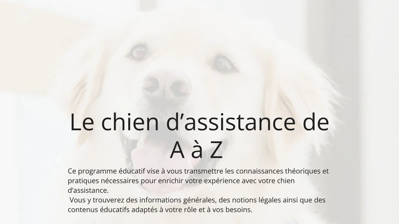 Le cours en ligne est inclus dans le module 2 du programme d'entraînement de votre chien d'assistance. Une fois le module entamé, nous vous donnerons accès au programme.